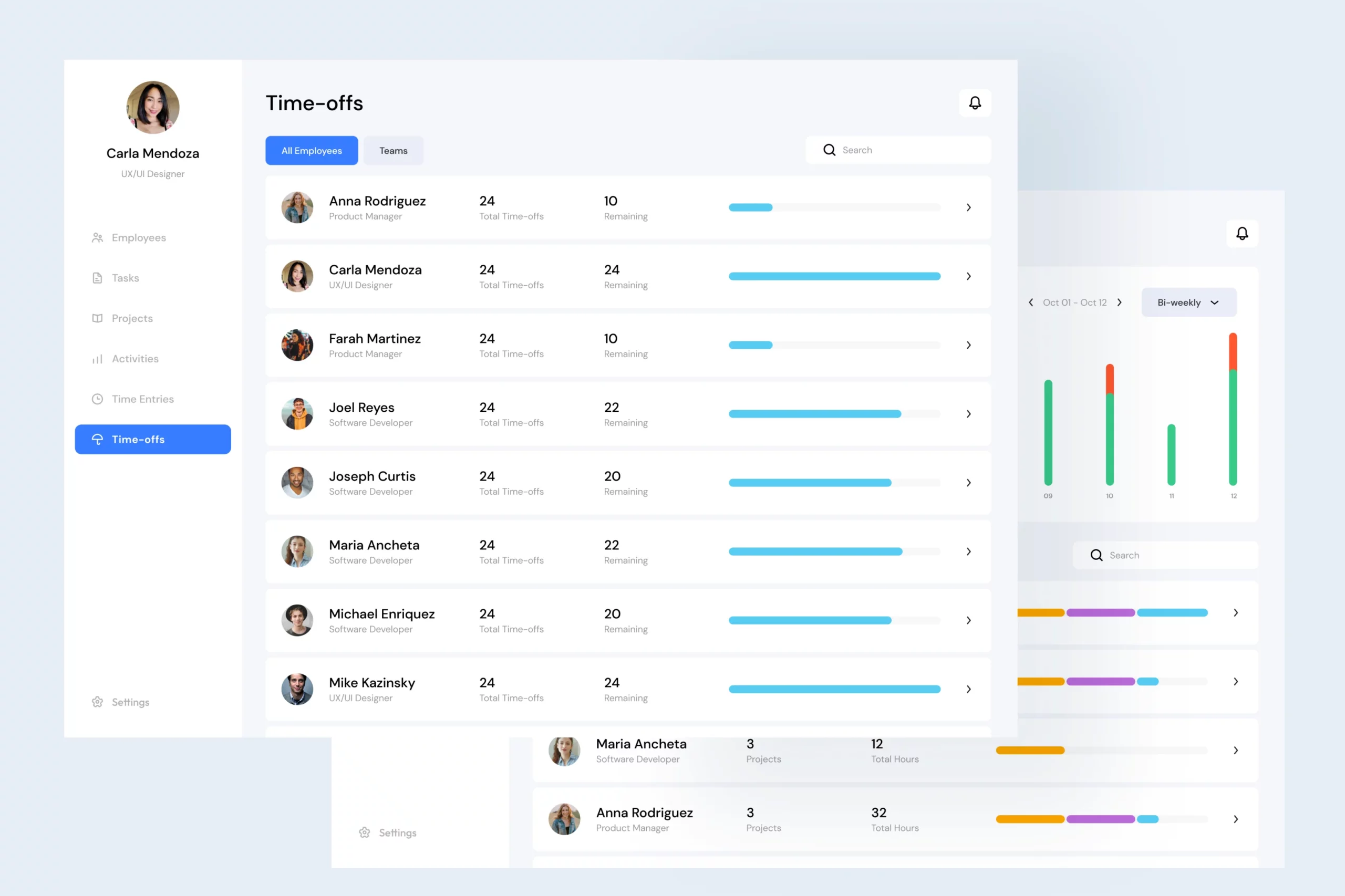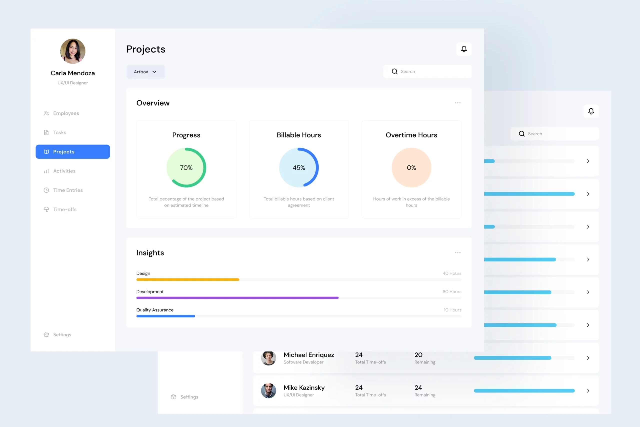 I designed a web app for time management. The product is used internally to track work hours and help clients have an overview of the billing costs that are due. Employees are able to track their workload based on hours spent on each project.